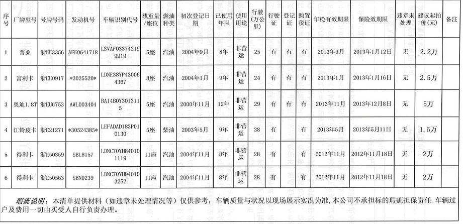 3、舊桑塔納、奧迪、富利卡、江鈴皮卡、得利卡汽車共六輛(詳見下列清單),整體拍賣,起拍價:15.2萬元。