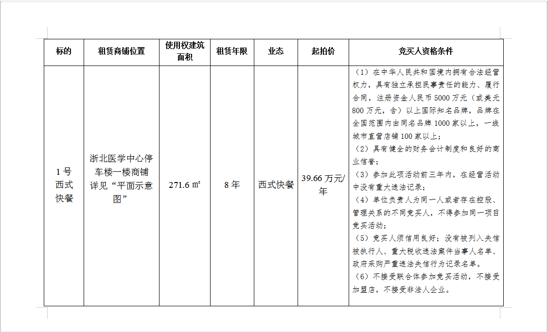 本公司依法接受委托,定于2020年5月19日上午10時,在浙江省湖州市紅豐路1388號嘉年華國際廣場C座6樓拍賣廳舉行拍賣會,現公告如下: 一、拍賣標的: 位于湖州市市北分區三環北路浙北醫學中心(湖州中心醫院)停車一樓商業房產約635.5平方米的商鋪租賃使用權。具體如下: 注:1、裝修免租期:標的(商鋪)交付之日起至計租日前一天止(不少于45天)。 2、承租期內,第1-2年租金不變(按成交價計收)。1號、2號標的,自第3年起,每二年年租金在前兩年年租金的基礎上遞增5%,以此類推;3號標的,第3-5年年租金在第2年年租金的基礎上遞增5%。 二、展示、咨詢、報名時間: 2020年5月12日-5月15日下午4時前。 三、注意事項: 有意者請按競買人資格條件要求,請攜帶相關證件、證明文件并交納每標的各5萬元競買保證金到湖州市紅豐路1388號6樓辦理競買報名登記手續。 四、保證金賬戶: 公司戶名:湖州昆侖拍賣有限公司 賬號:201000177544498 開戶行:湖州吳興農村商業銀行南太湖新區支行 五、聯系人: 0572-2110887 13587268533劉女士 0572-2024490 邵先生 湖州昆侖拍賣有限公司 浙江聯合拍賣有限公司 二〇二〇年五月八日